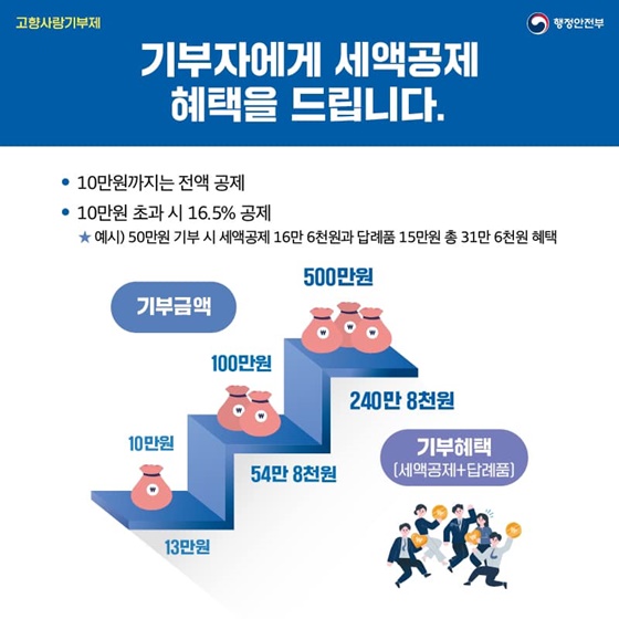 대신 기부자는 전액 세액공제 혜택과 지역의 특산품을 답례품으로 받을 수 있습니다.