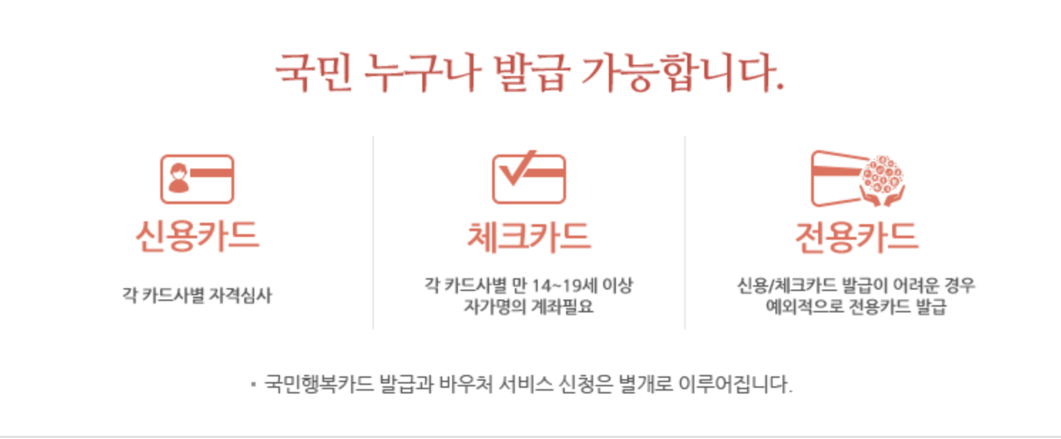 국민행복카드는 각 원하시는 카드사에서 발급 후 지원받고 싶은 바우처를 개별로 신청하셔야 지원 혜택을 받으실 수 있습니다.
