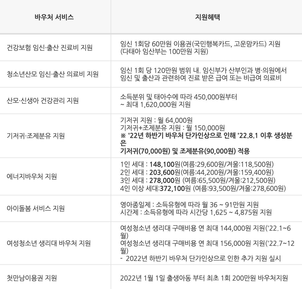 임신 출산 진료비부터 에너지 바우처, 사회 서비스 사업 9종, 아이돌봄 지원사업, 여성청소년 생리대 바우처, 보육료 및 유아학비, 청년들을 위한 혜택까지 지원해주는 카드로 전 국민 누구나 신청 가능합니다.