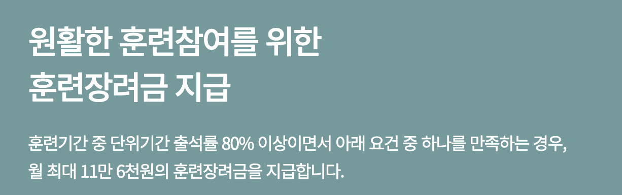국민 스스로 직업능력개발훈련을 실시하도록 훈련비를 제공하는 내일배움카드는 최대 500만원 지원할 뿐만 아니라 지원자에게 훈련장려금도 현금으로 지급하고 있습니다. 신청한 교육과정에 80% 이상 출석한다면 매달 116,000원의 훈련장려금을 받을 수 있습니다.