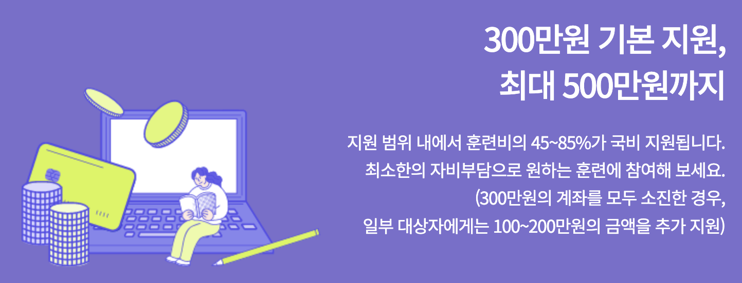 지원금액은 인당 300만원으로 300만원 금액을 전부 소진한 경우 예외적으로 일부 인원에게 최대 500만원까지 지원합니다. 훈련과정에 따라 다르지만 일반참여자의 경우 교육과정 부담금의 45%~ 85% 의 금액까지 지원받을 수 있습니다. 나머지 금액은 자기부담금으로 연계된 카드로 결제해주시면 교육이 신청 가능하니 참고하시면 좋겠습니다.