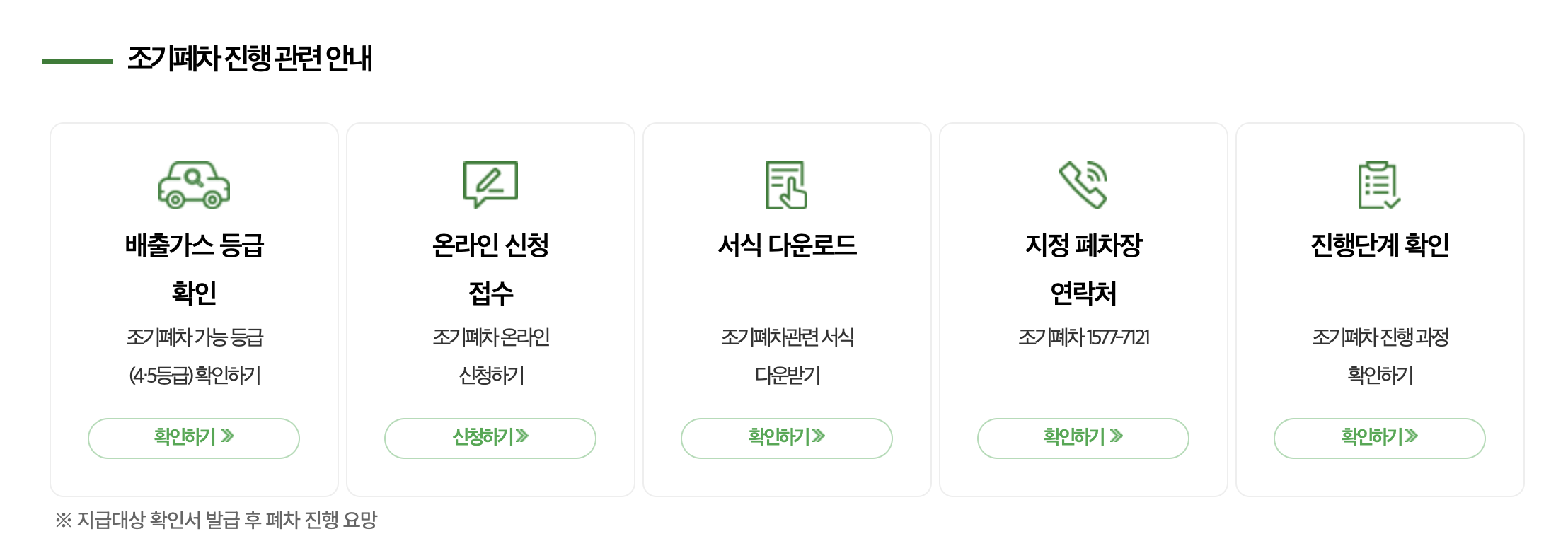 먼저 조기폐차 신청 전에 배출가스 등급 확인은 필수로 해주시고, 자동차 배출가스 등급 홈페이지를 통해 신청 가능합니다.