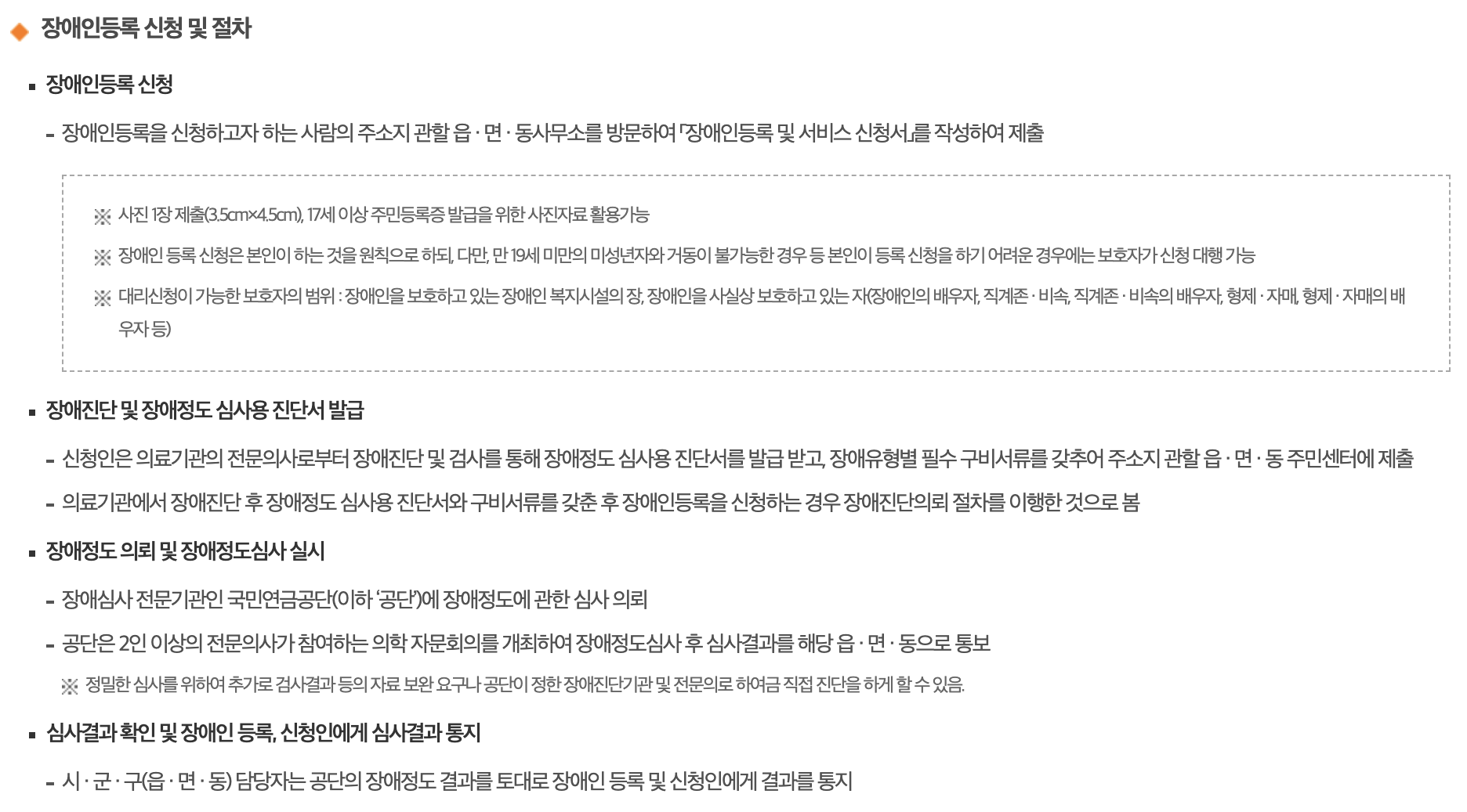 - 거주지 관할 주민센터 방문하여 장애인 등록 및 서비스 신청서를 직원에게 제출