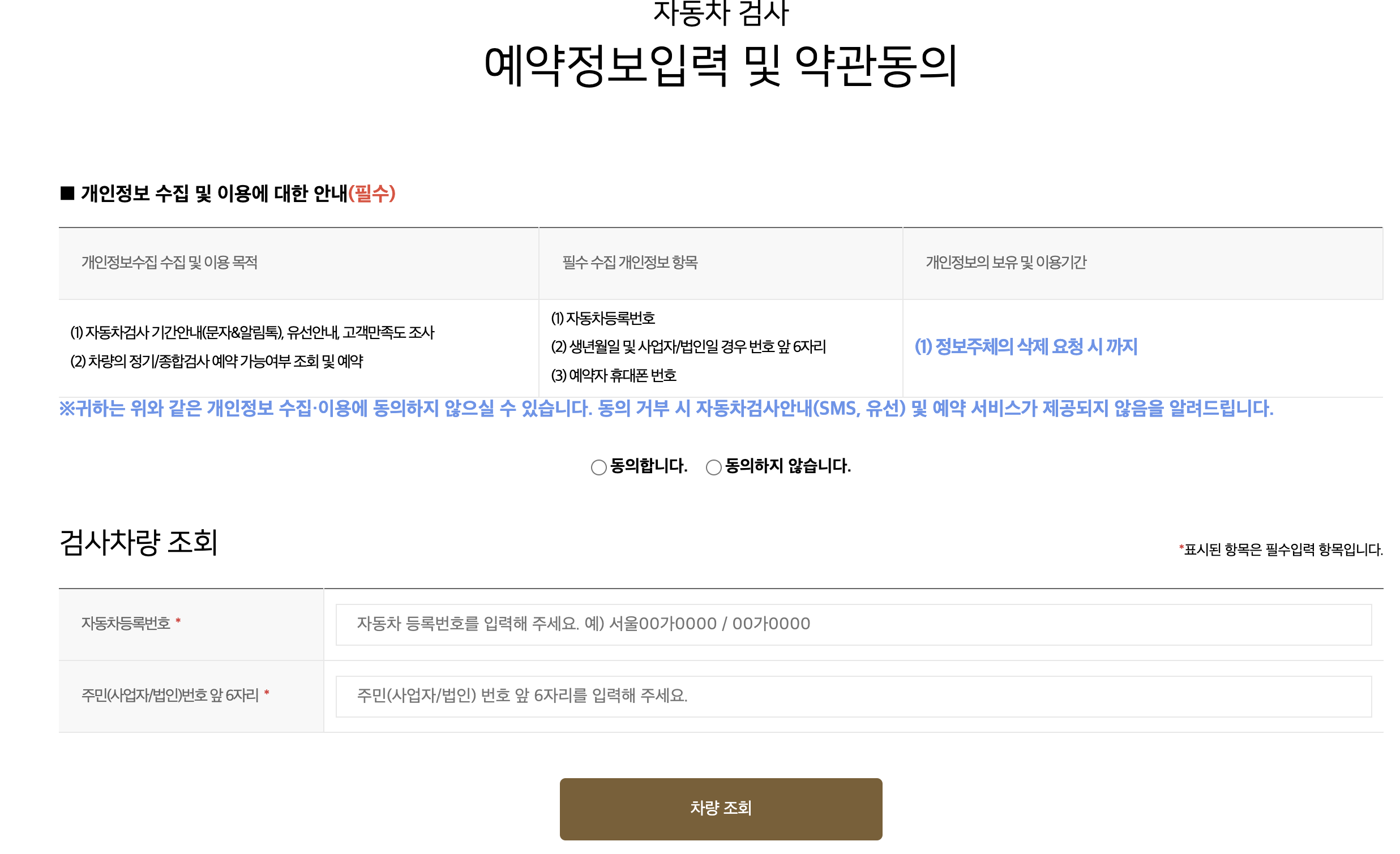 다음 화면에서 개인정보 수집 및 이용에 대한 안내를 읽어보시고 동의 체크 후 하단에 차량번호와 차량 소유주 생년월일을 입력 후 차량 조회를 클릭하시면 자동차검사 예약을 간편하게 하실 수 있습니다.