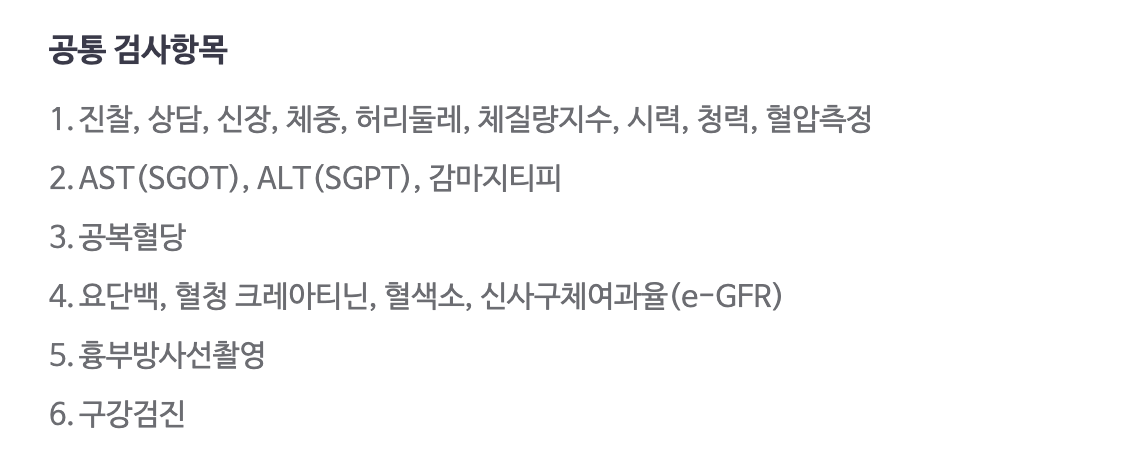 공통적으로 진행하는 검사 6가지와 더불어 성별과 연령별로 검사가 추가로 이루어집니다.