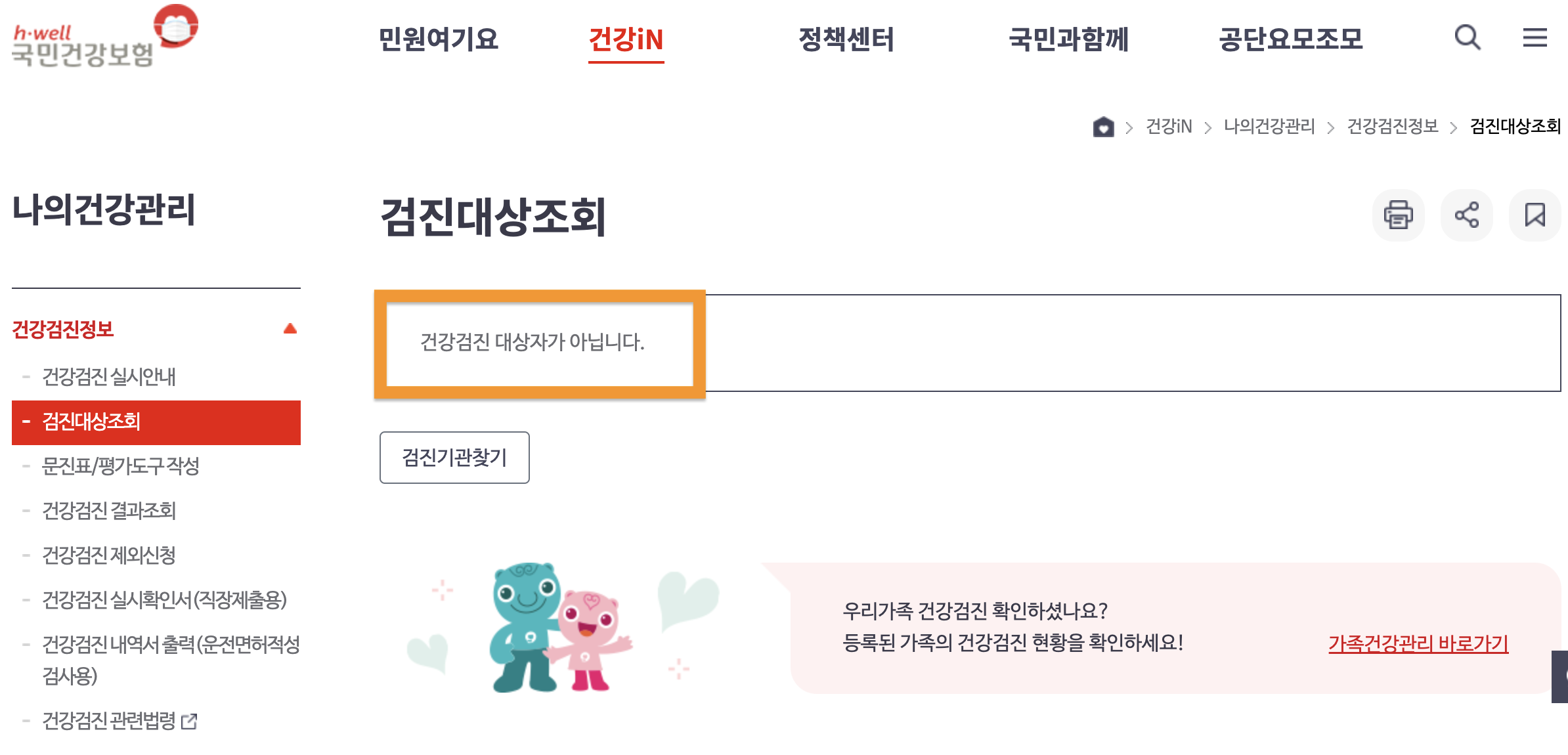 건강검진 대상자인지 조회하는 방법은 굉장히 간단합니다. 사이트 바로가기를 클릭하시고 간편 로그인 (카카오톡,네이버)만 해주시면 바로 검진대상인지 바로 확인하실 수 있습니다. 건강검진 대상자일 경우 주황색 음영표시된 부분에 건강검진 대상자로 안내멘트를 보실 수 있습니다.