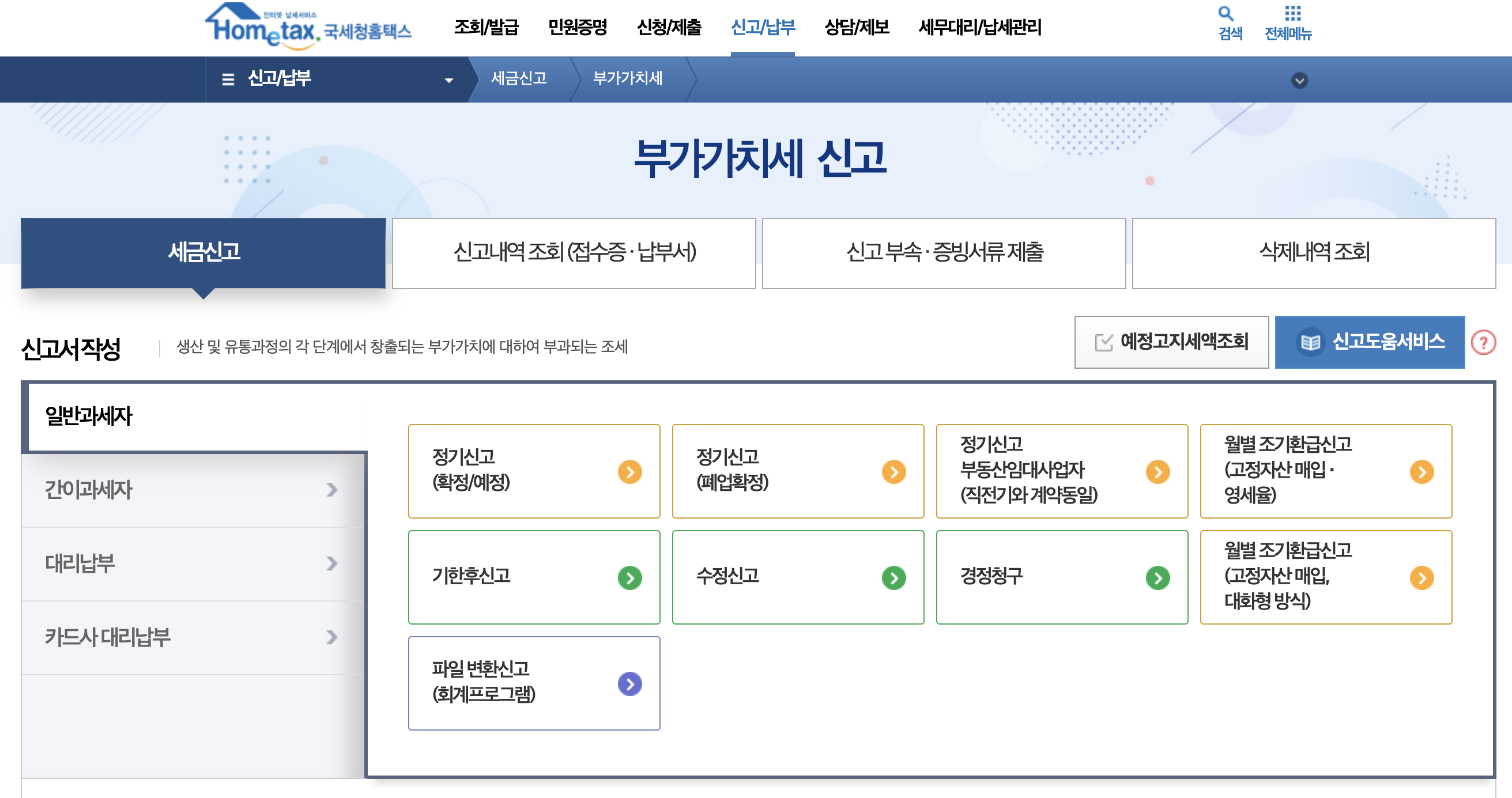 온라인으로 진행할 경우, 홈택스 로그인 먼저 진행하신 후 상단 카테고리에 신고/납부란에 있는 부가가치세 신고를 클릭하시면 간편하게 신청하실 수 있습니다.