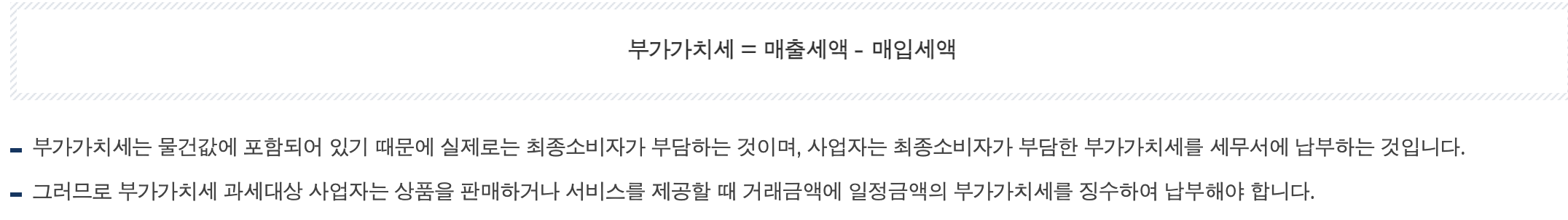 부가가치세는 상품의 거래나 서비스가 제공되는 과정에서 얻어지는 이윤에 대한 과세하는 일종의 세금입니다. 즉, 법인사업자 혹은 개인사업자가 납부하는 것으로 매출세액에서 매입세액을 차감하여 계산하는 것을 부가가치세라고 칭합니다.